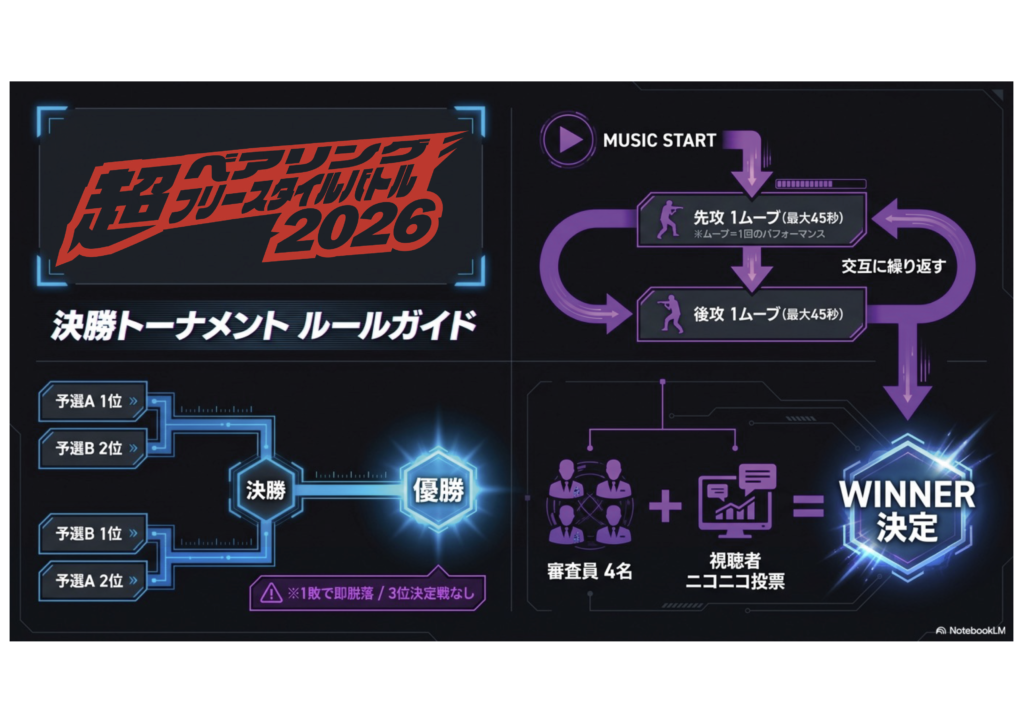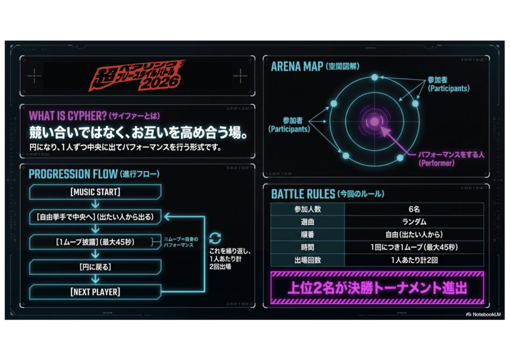 今回は12名の参加となり6名x2回のサイファー形式の予選かからトーナメント進出の4名を決定する方式となります。(昨年のまとめ記事もご覧ください)