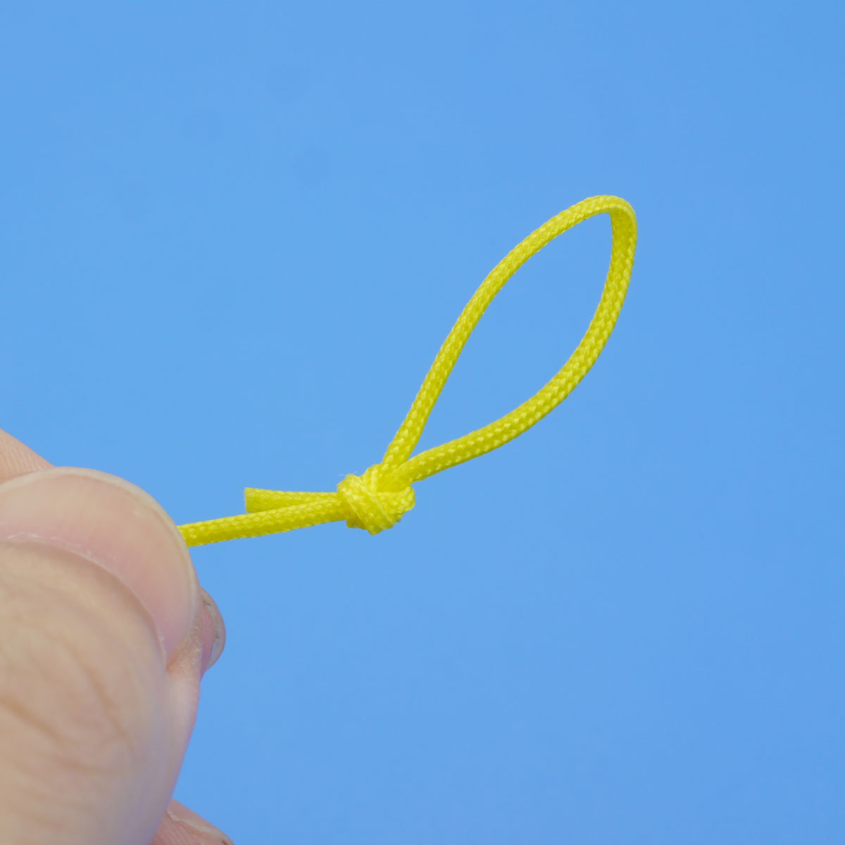 ユニノットが難しい場合は、ヨーヨーのフィンガーホールの要領で取り付ける方法もあります。写真のように輪を結んで、