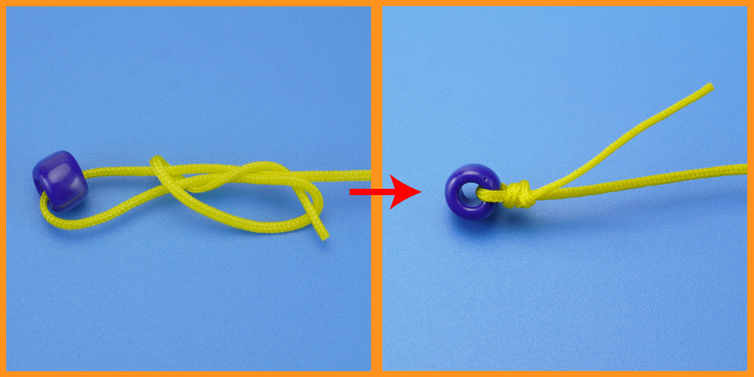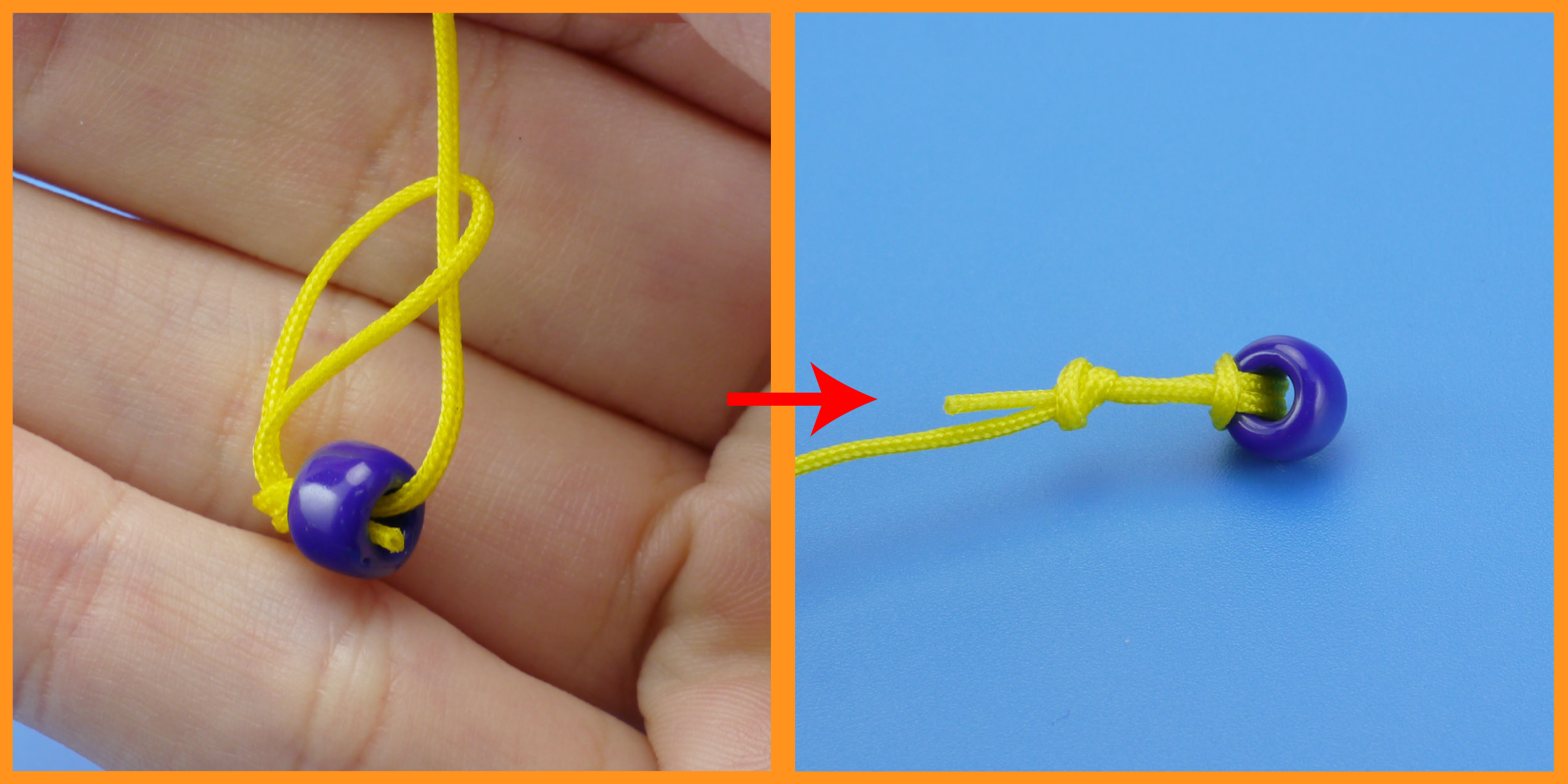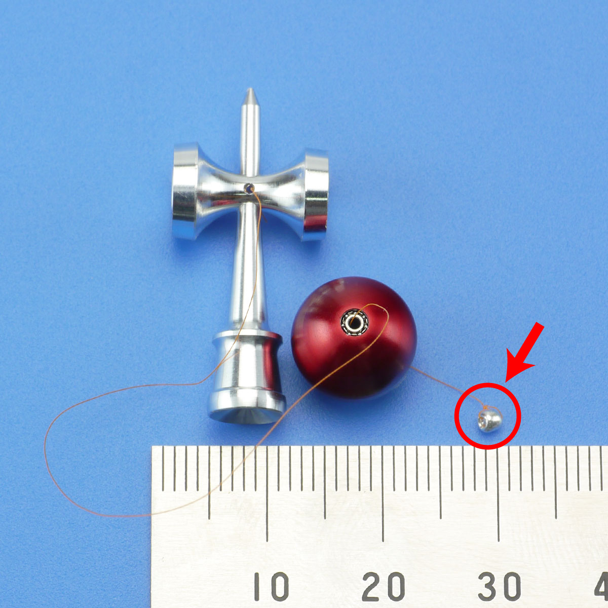 赤い丸で示した小さいビーズに糸を結びます。糸が細いので、通常のけん玉のようにコブを作って抜けないようにするのではなく、結びつける必要があります。