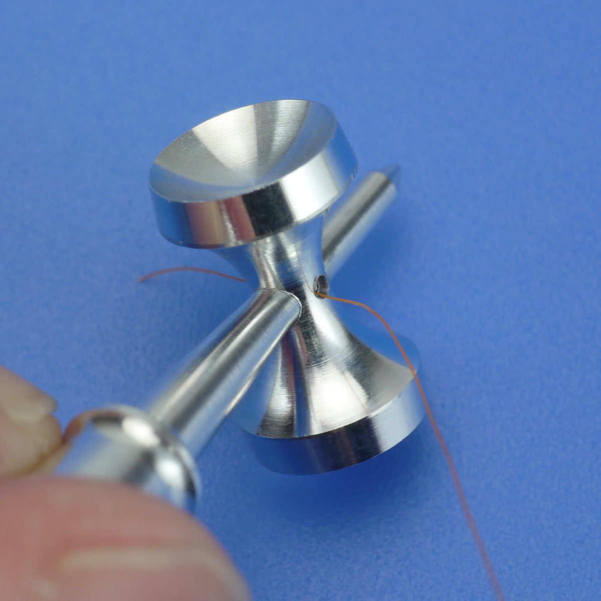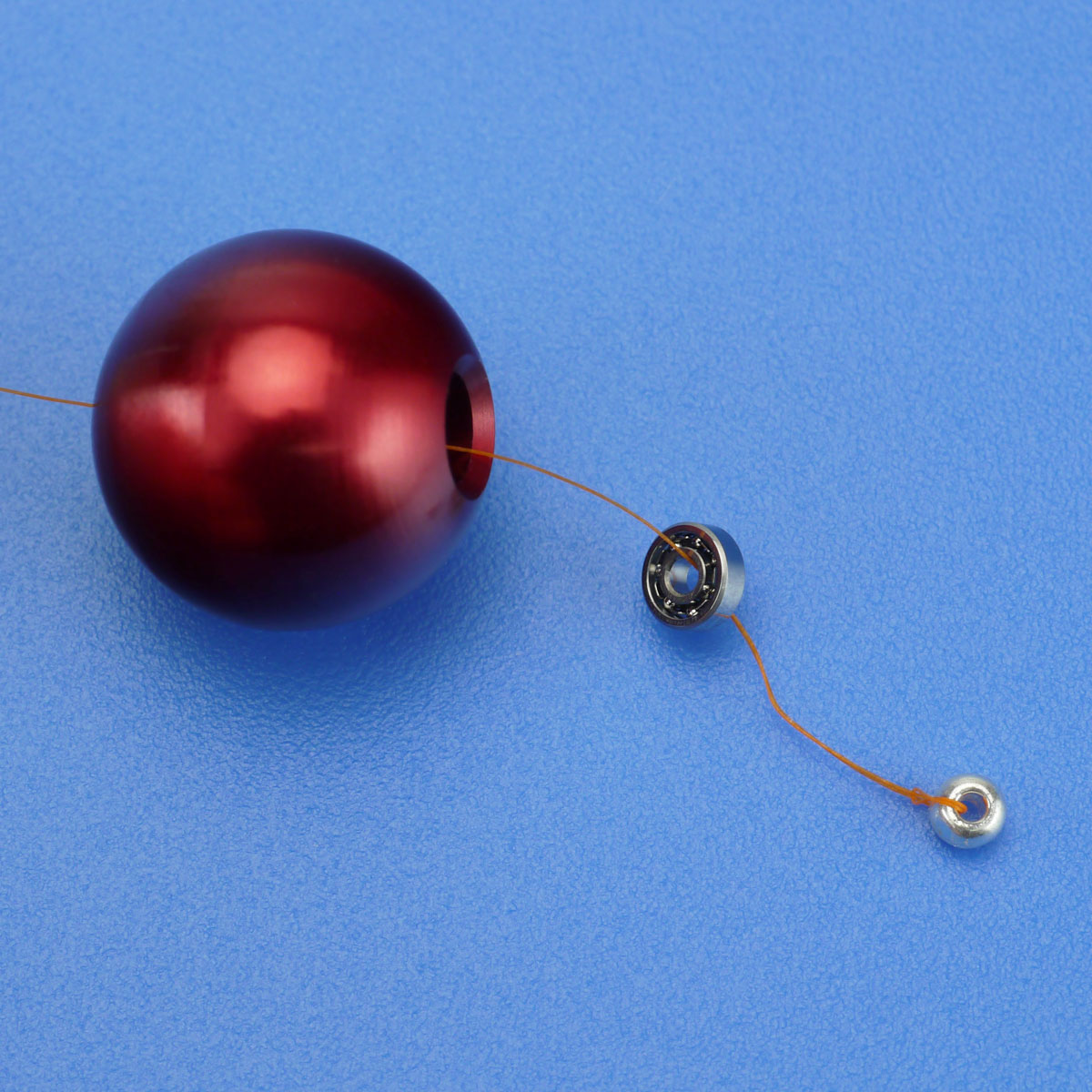 ベアリングが抜けている場合は先に写真のように糸を通してから組み立てると楽です。ベアリングは玉の穴に無理に押し込もうとすると破損の原因となりますのでご注意ください。穴に対して真っすぐに入れると抵抗なくスッと入る設計になっています。