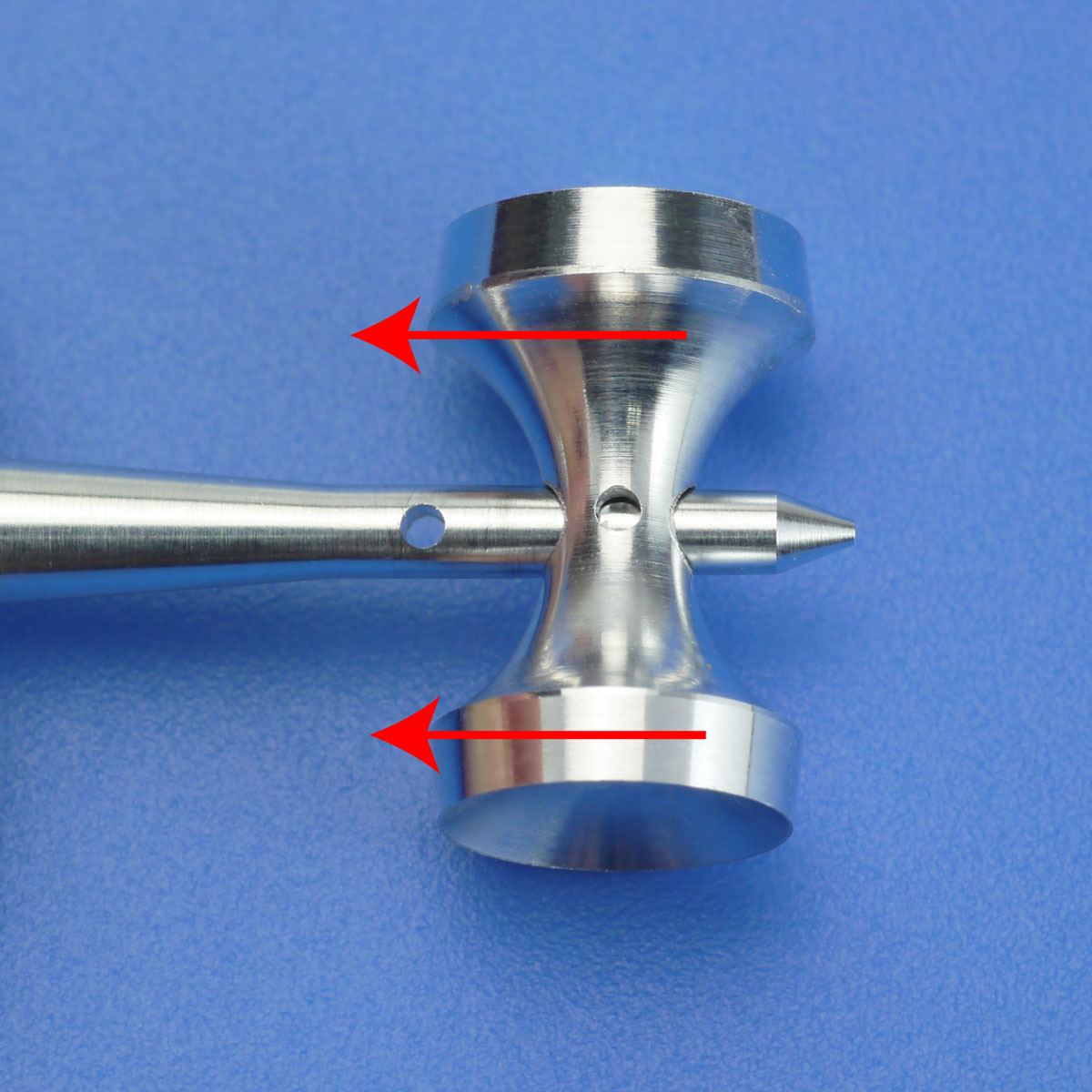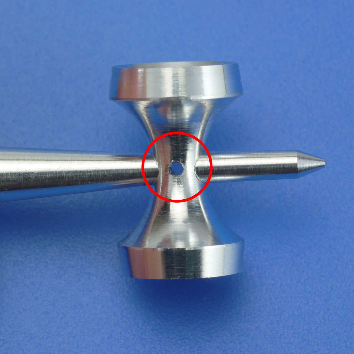 けんの組み立ては通常のけん玉と同じように皿胴とけん軸を押し込みます。皿胴と軸それぞれの穴が合う向きで組み立ててください。