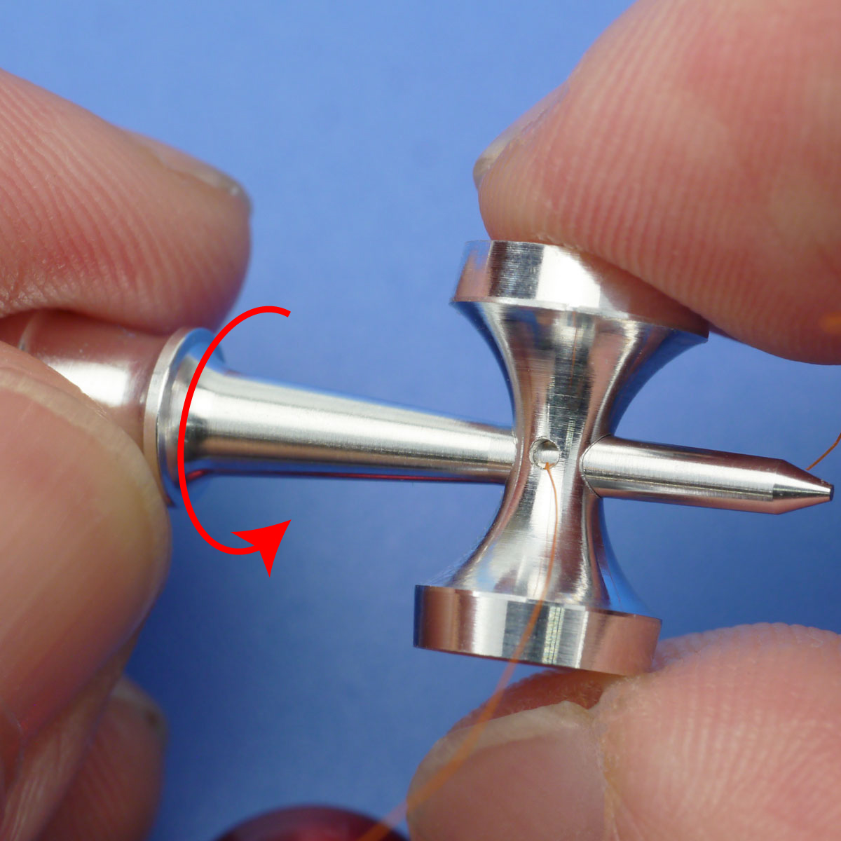 好みの糸の長さのところで、軸を回してけんの穴をずらし、挟み込んで糸を固定します。余った糸はハサミで切ってください。