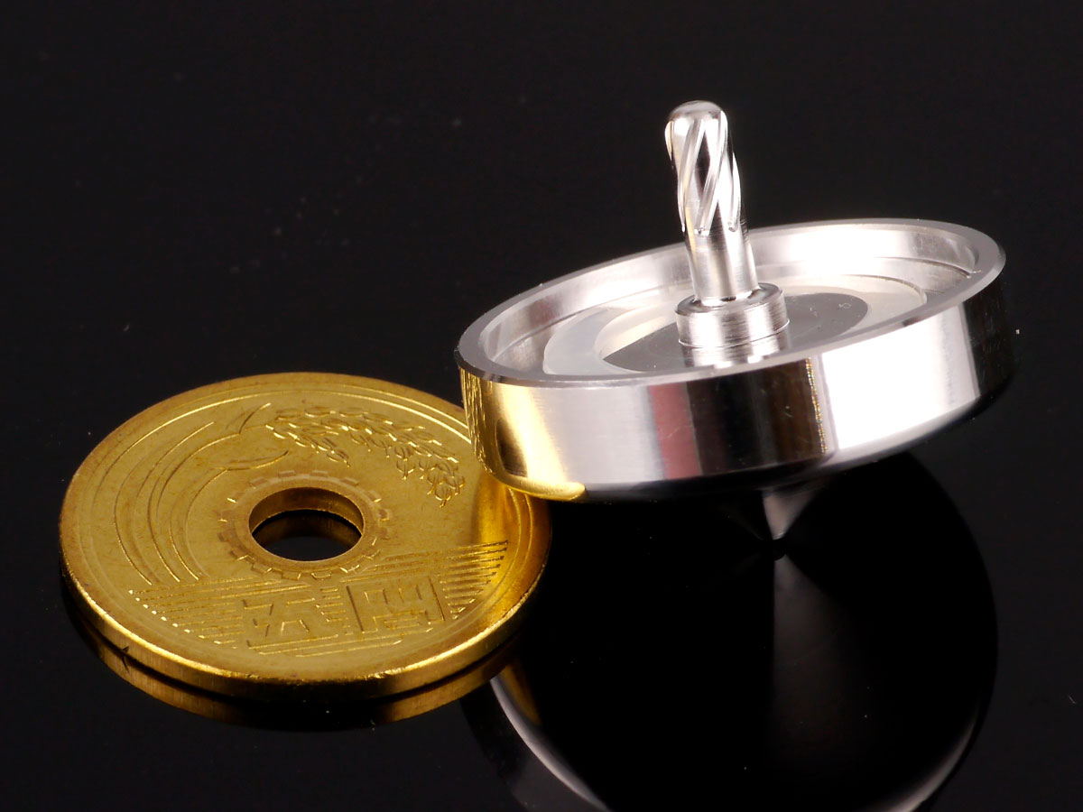 アルミボディの軽快なまわりだしを”気持ちいい”と感じたのであえて長時間モデルとしては制作しておりません。空転時間は2~3分程度です。独楽の回す場所、回し手の技術にも大きく左右されるので”長時間回る精密独楽”ではないことを御理解の上、お買い求めください。5円玉のギミックだけではなく、独楽本体のみでまわしたときも重さがなく、軽い力で回るのでお子様にもおすすめです。