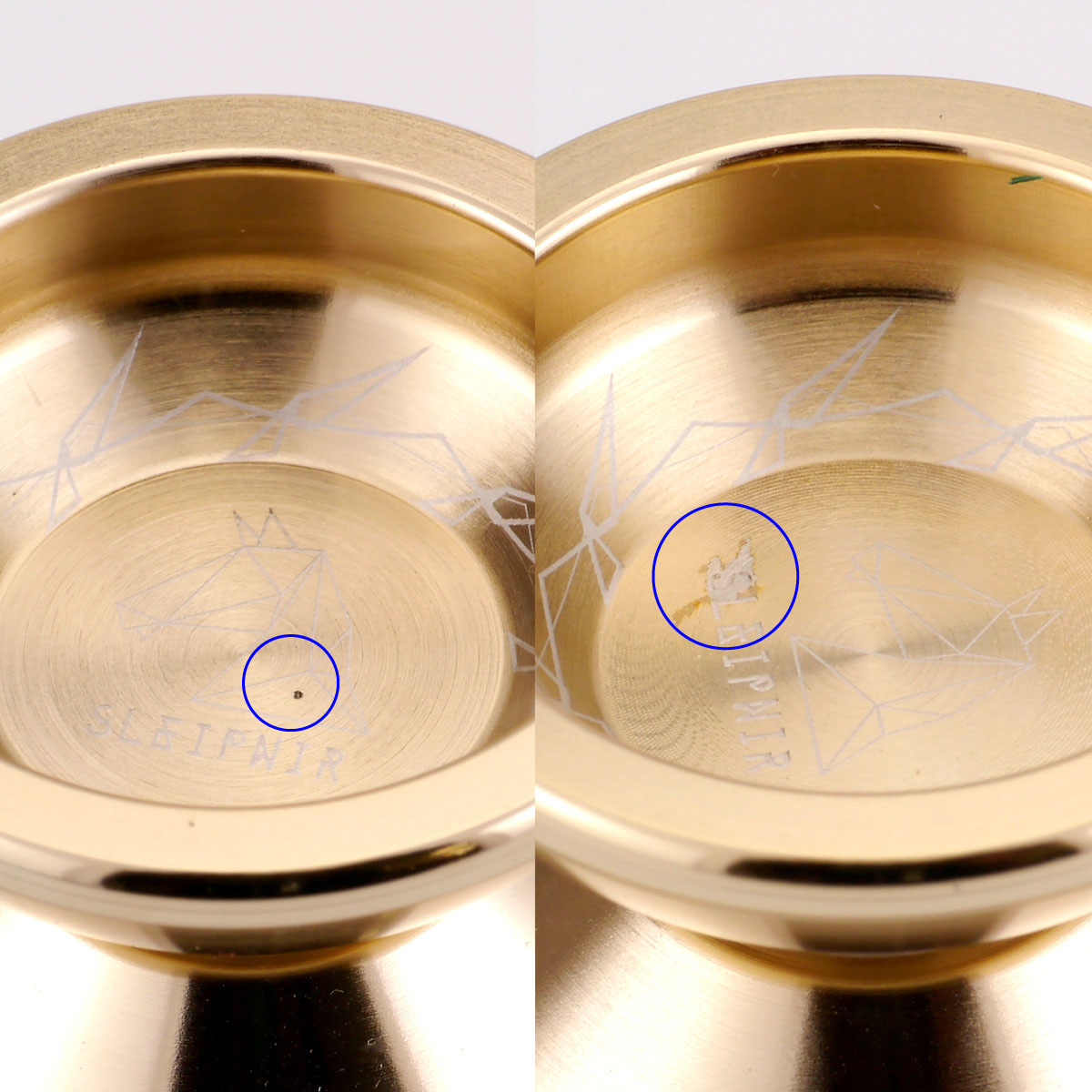 ゴールドの被膜を形成する都合上、ほかのカラーよりもブレが大きくでてしまう傾向があり、ほかの種類よりもブレが大きいです。ヨーヨーとして使用する分には問題はありませんが、大きめのブレが出ることをご了承ください。