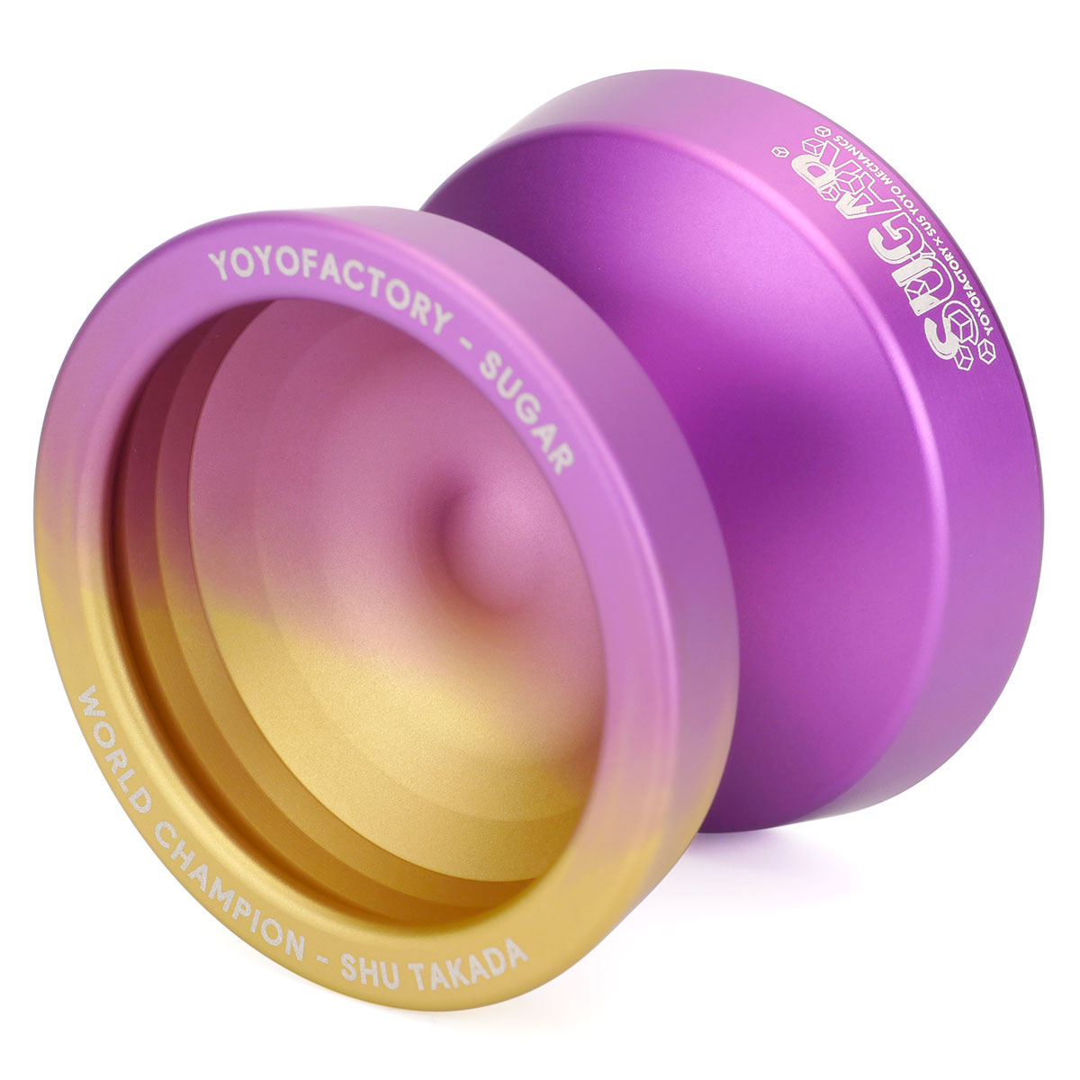 ※フェイス側のロゴ(YOYOFACTORY-SUGAR WORLD CHAMPION - SHU TAKADA)は両面に刻印されています。リム側面のSUGARロゴは片側のボディにのみ刻印されています。