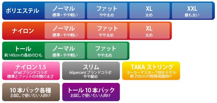 今までありそうで無かった、「ノーマル」と「ファット」と言うKitty Stringにおいて、また競技シーンにおいて近年メジャーな二つの太さタイプの”中間”の太さを提案しました。素材は、ポリエステルに比べ弾力が適度で、強度が高く、耐久時間が若干長いと感じたソフトナイロンを選択しました。この後数種類のサンプルを作っていただき、試してみたところ、その内の一つが、コンボ、フック双方において絶妙な使用感を誇っており、それが現在の製品版の礎となりました。 ちなみに、今年の東日本大会Bブロックでは、当方ストリングにこのサンプルを起用し、優勝に漕ぎ着けました。このことにより、”Nylon 1.5”が、岩澤の私的体験に留まらず、同じ様な理想を持つプレイヤーに対する一つの普遍性を持った選択肢として提示されたと感じています。 名前の由来としては、素材がソフトナイロンなのでそのままナイロン、加えて太さがノーマルとファットの中間と言うことで合わせて「ナイロンミディアム」と呼ぶのはどうかと提示した所、Hiro Kobaさんが私のフックを0.5回転ずつ巻数を増やしていくプレイスタイルに準えて、”Nylon 1.5”と名付けてくださり、それが商品名となりました。
