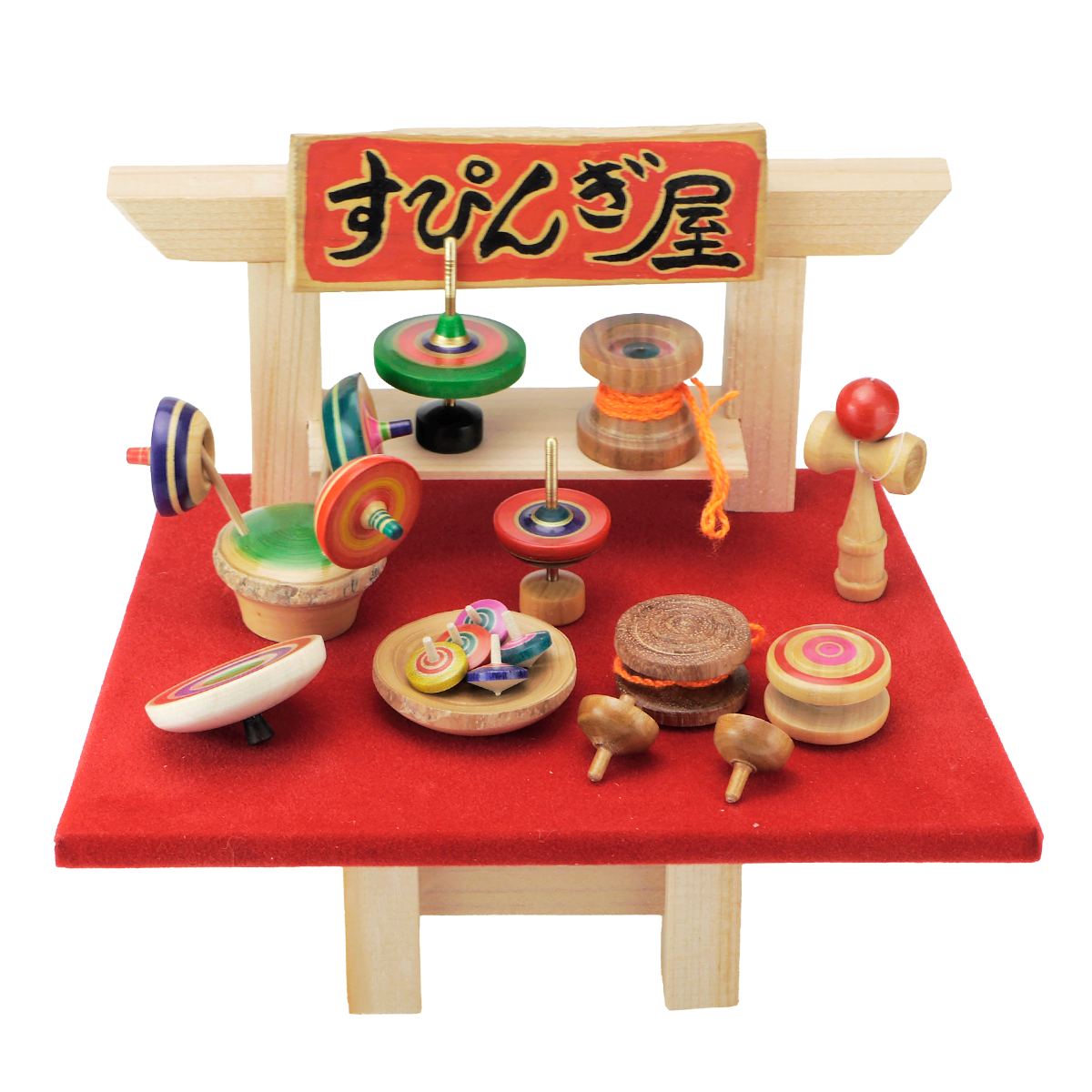 江戸独楽職人、福島保さんの真骨頂、豆玩具をまとめてすぴんぎ屋として制作していただきました。すべて遊ぶことができるミニチュアだけではないこだわりの小さな玩具たちです。一般的に江戸独楽、豆玩具はサイズが小さくなればなるほど作るのが難しく、値段も高くなります。江戸趣味の粋をスキルトイでも表現してもらいたいと思い別注をしています。