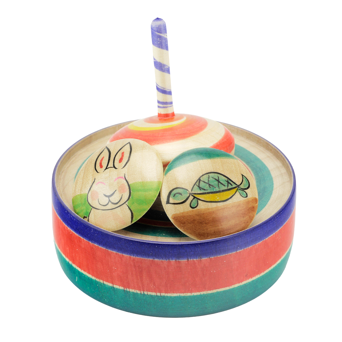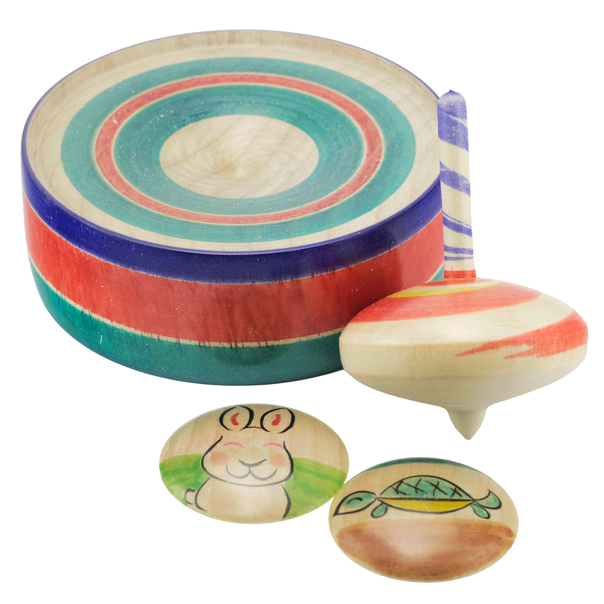 昔話、うさぎと亀をモチーフにした江戸独楽です。ウサギのこまと亀のこまが追いかけっこをしてうまく回せると亀がウサギを追い抜いていきます。