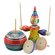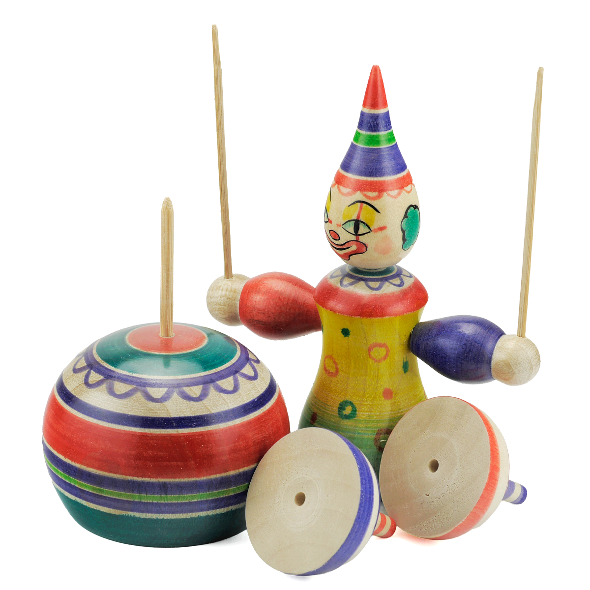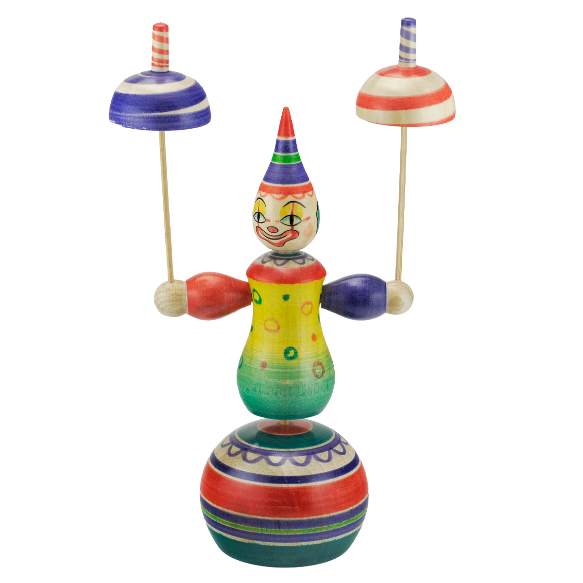 玉に乗るピエロが皿を回しながら自分も回る愉快なこまです。