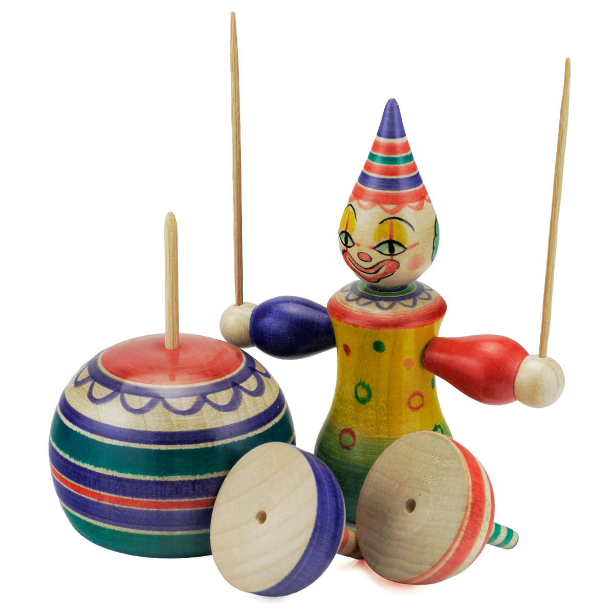 玉に乗るピエロが皿を回しながら自分も回る愉快なこまです。