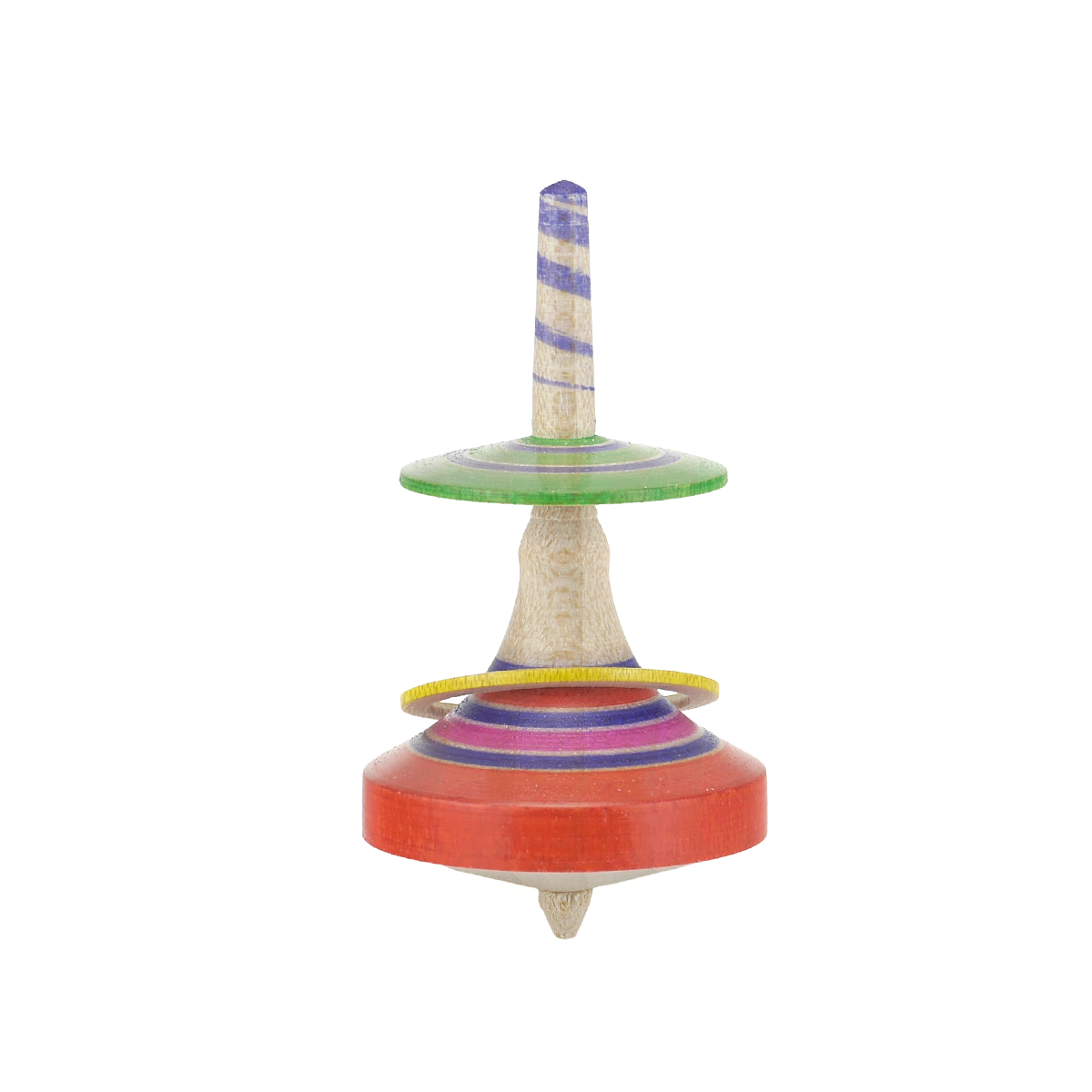 江戸独楽職人の遊び心で生まれた浮き輪独楽。旋盤で削り出す工程で輪っかを残して壊さないように削り出しています。見た目には後からはめることが不可能な構造をしているので大人にとっては作り方が不思議に見える独楽です。