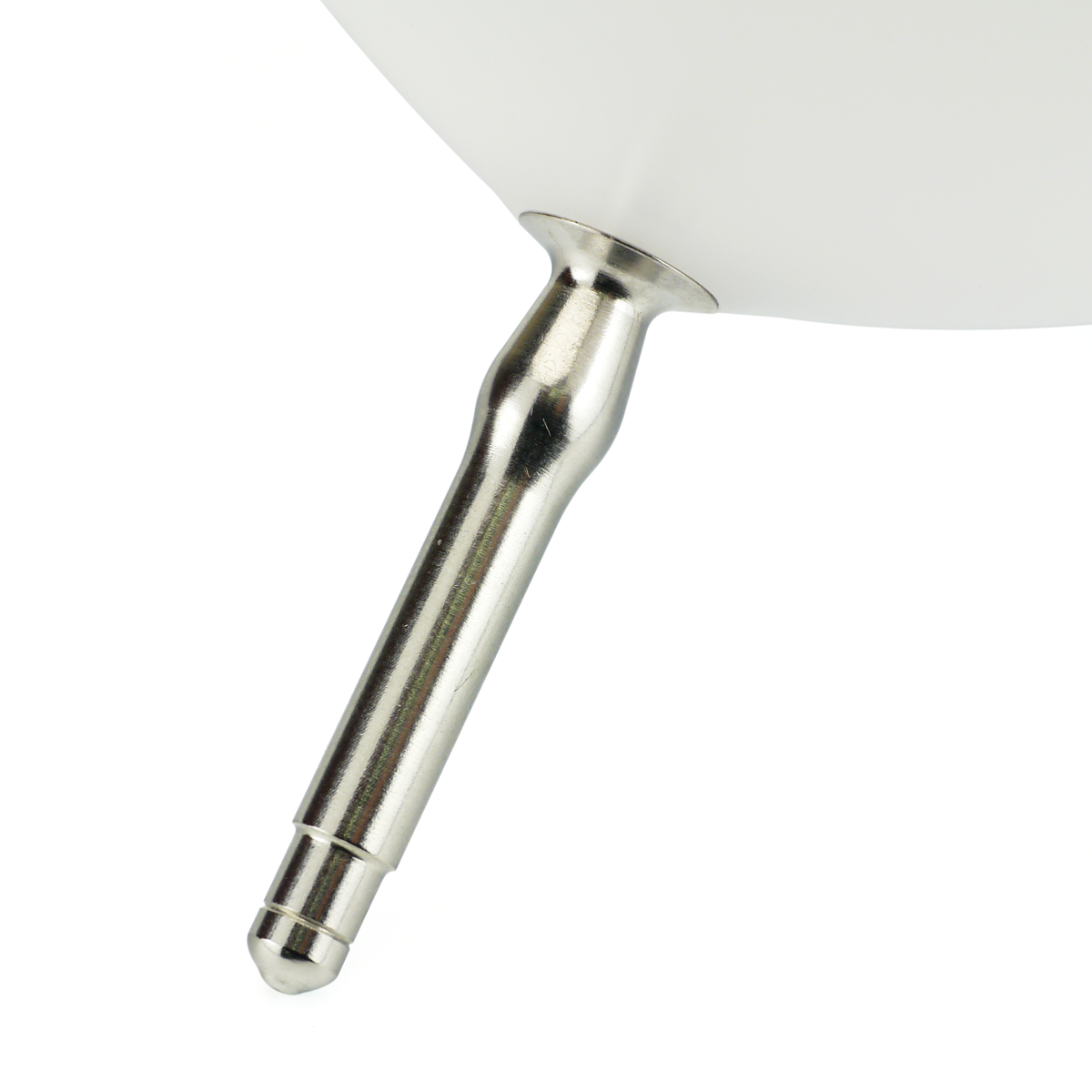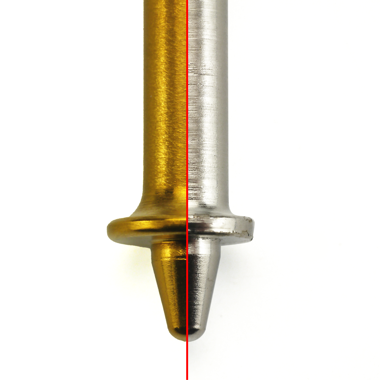 従来の太軸と同じ、エレベーターがやりやすく強度も高い”太さ”はそのままに素材をステンレス化。さらに直角に近かった先の部分にRをつけてやや抜けやすくしました。(写真左側が新型ツル用の新アクセル)