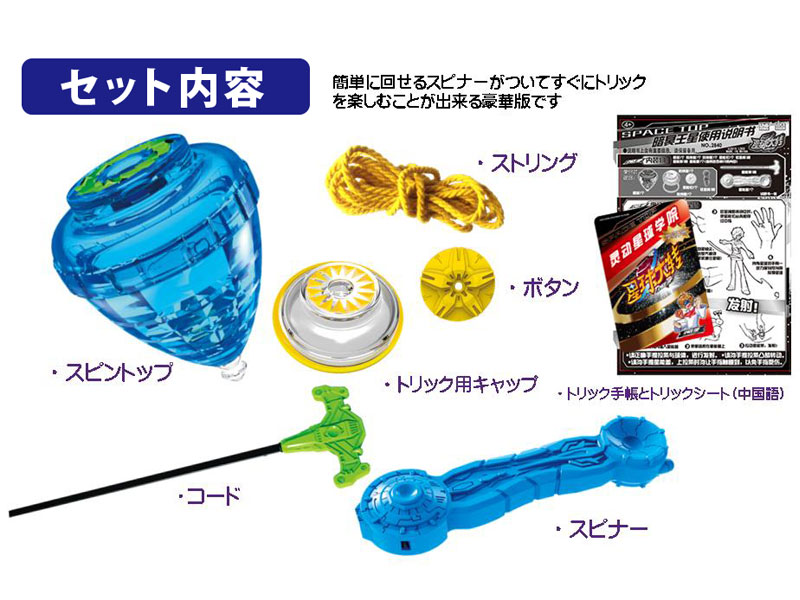 スターターセットはスピントップ本体、ストリングの基本セット+どなたでもスピントップを簡単に回すことが出来る(スピナー)シューターが附属しています。