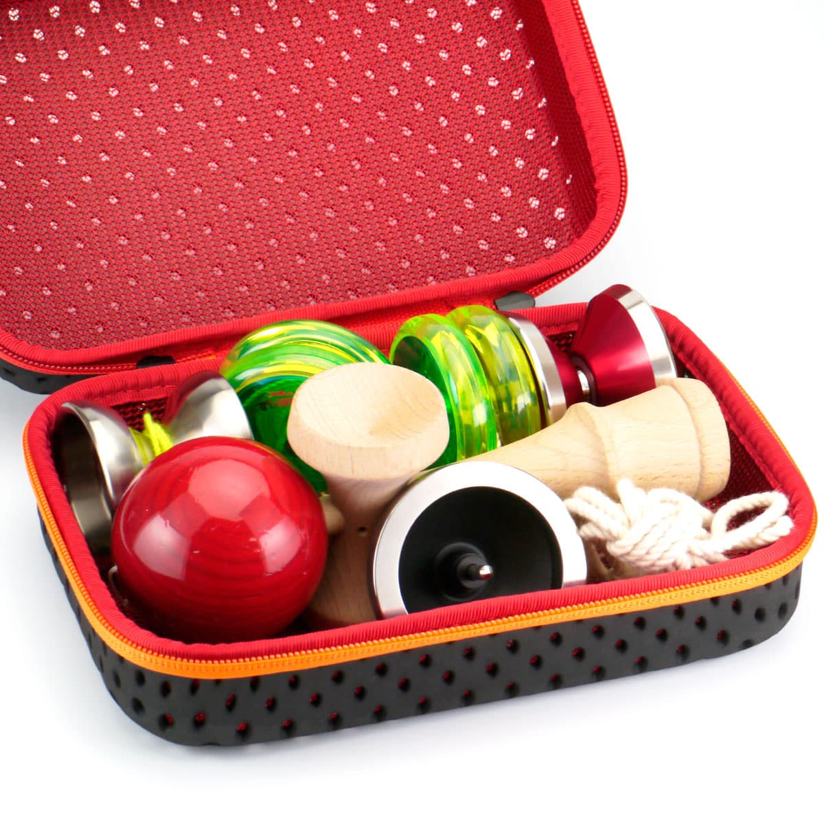 そしてこのケースのもともとのコンセプト、ヨーヨーもこまもけん玉もとりあえず持ち運ぶ。です。いままでけん玉は巾着袋に、ヨーヨーはヨーヨーバック、こまは100円均一のクリアケースなど道具によってケースそのものを使い分けていたと思いますが、スピンギアの提案するスキルトイライフは1つにまとめてコンパクトにすることでより普段からすべての道具を持ち運び、気軽に遊んでもらいたいという想いでデザインしました。1日で必要な道具を選び、ピッタリと収まる分だけ持ち運び楽しみ切る。シンプルに必要なものだけを残すミニマリズムなスキルトイの楽しみ方もできればと思います。