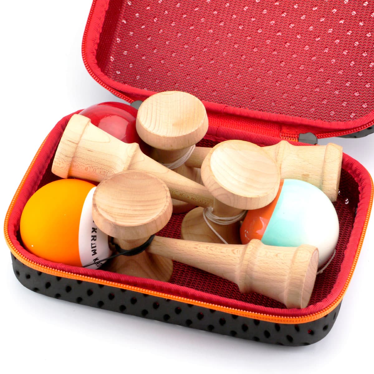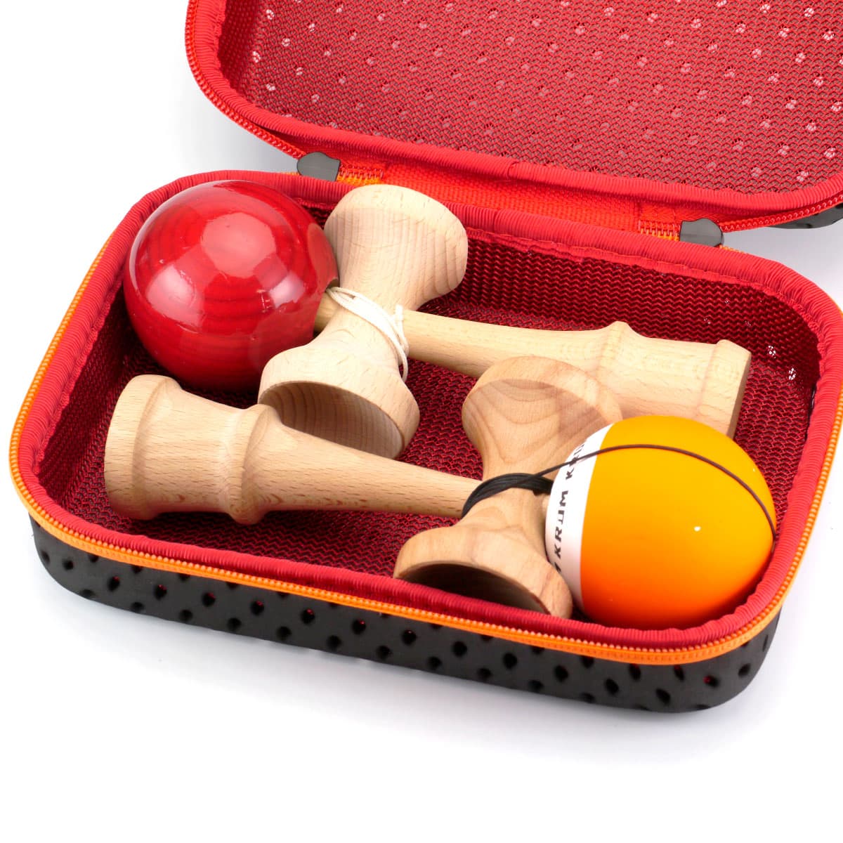 今回、4A収納と並んでケースの内寸を決定する要素となったのが3本収納です。予備けん玉は詰め込み、使用分はさっと取り出せるダマシェルで。
