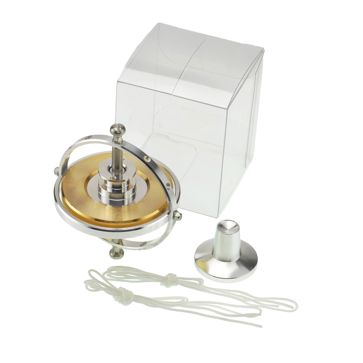 従来のジャイロスコープは軸に穴が空いておりそこに紐を通して巻き付けていました。東京ジャイロは軸が回転しないため、紐の巻き方が特殊です。