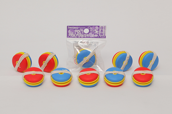 国産のヨーヨー、こま、けん玉などの消しゴムです。要所要所でプラスティックパーツが使用されており、ヨーヨーは上げ下げだけでなく、ループ、こまもてのせ、けん玉は皿、剣はもちろん飛行機もできます。どれだけできるかチャレンジしてみてください!