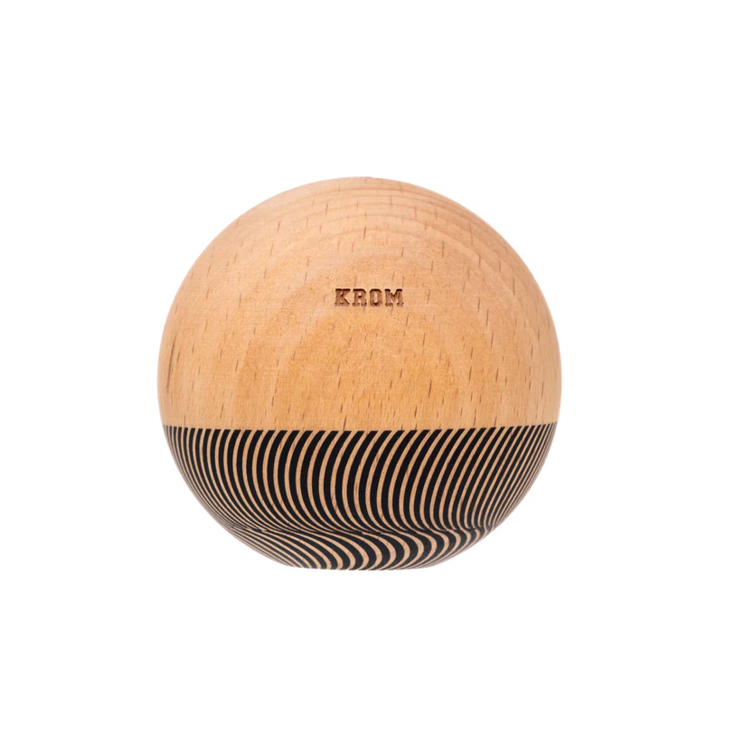 小さなKROMロゴがおしゃれです。反対側には"NOT FOR SALE"(非売品)、そして塗装の種類、直径、使用木材の刻印が施されており、まるで新開発商品の非流通サンプルのようなデザインになっています。