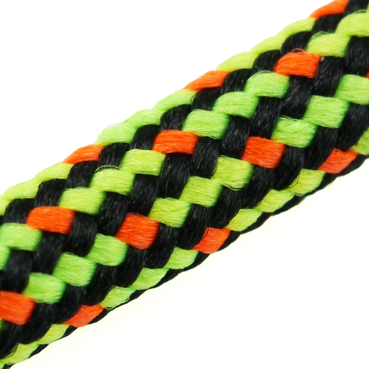 ノーマル9芯は一般的なパラコードと同じでしっかり紐巻きができ、ゼロスタの加速もムチもやりやすいです。黒をベースに目立つ蛍光色で構成。わかりにくいですがオレンジxグリーンxイエローと3色の差し色で合計4色の色を使っています。競技を意識した、ステージ上で映える、認識性の高いストリングを目指して作りました。